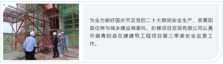 为深入贯彻习近平总书记关于疫情要防住、经济要稳住、发展要安全的重要指示精神,认真落实市委市政府工作部署,确保国庆节和党的二十大期间安全生产,为二十大胜利召开营造良好的社会环境,青阳县住房与城乡建设局委托阶梯项目咨询有限公司作为第三方专业机构对在建建筑工程安全生产开展第三方巡查服务工作,并每季度对全县所有在建建筑项目进行一次“全覆盖”巡查,不定期组织专项安全检查和安全隐患整改闭合情况“回头看”,以进一步加强青阳县建筑工程项目安全监督管理。