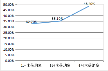 项目落地率,指执行和移交两个阶段项目数之和与准备、采购、执行、移交4个阶段项目数总和的比值。因目前尚无项目进入移交阶段,此次统计口径的调整并不影响与之前公布数据的一致性。处于识别阶段的项目没有纳入落地率计算,主要考虑在这个阶段的项目尚未完成物有所值评价和财政可承受能力论证,只能作为PPP备选项目。按此口径计算,6月末两批示范项目落地率48.4%,比3月末的35.1%增长13.3个百分点,如图1-2-1。