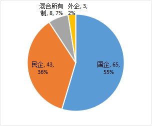 目前,105个落地示范项目中,82个已录入签约社会资本信息,包括54个单家社会资本参与项目和28个联合体(多家社会资本联合参与)项目,签约社会资本共119家,其中民企43家、混合所有制8家、外企3家、国企(国有独资和控股企业,含海外上市国企)65家,民企占比36%,前三类非国企合计占比45%,如图1-4-1。