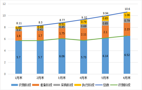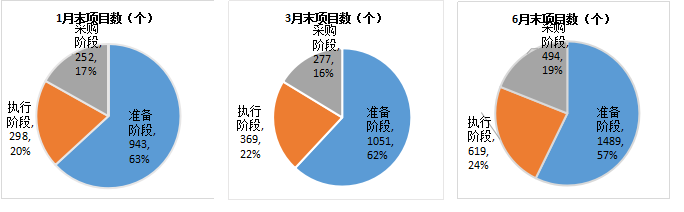 按落地率口径计算,1、3、6月末落地率分别为20%、21.7%、23.8%,呈现稳步提升特征。1、3、6月末准备、采购和执行阶段项目数如图2-2。