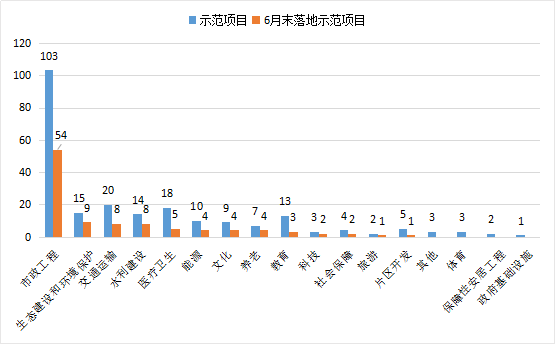 105个落地示范项目中,市政工程类项目54个,占51%;生态建设和环境保护9个,占9%;交通运输8个,占8%;水利建设8个,占8%;其他26个,占24%,详见图1-5-1。各行业示范项目总数与6月末落地数如图1-5-2。
