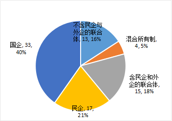 82个项目中,民企、含民企与外企的联合体、混合所有制企业、国企、不含民企与外企的联合体参与项目分别为17、15、4、33、13个,民企和含民企与外企的联合体参与项目合计占比39%,前三类非国企合计占比44%,如图1-4-2。