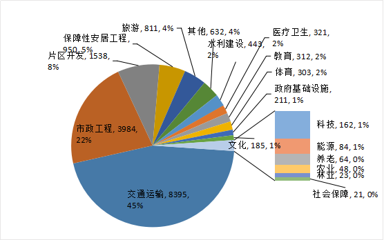 3. 片区开发:554个项目总投资额1万亿元。其中,园区开发和城镇化建设2个二级行业的项目分别为280个、125个,占片区开发项目总数的73.1%;这2个二级行业的投资额分别为4,765亿元、3,606亿元,占到片区开发项目总投资额的82.7%。