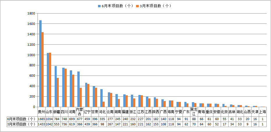各地方6月末与3月末的项目数、投资额对比情况分别如图2-3-1和图2-3-2。