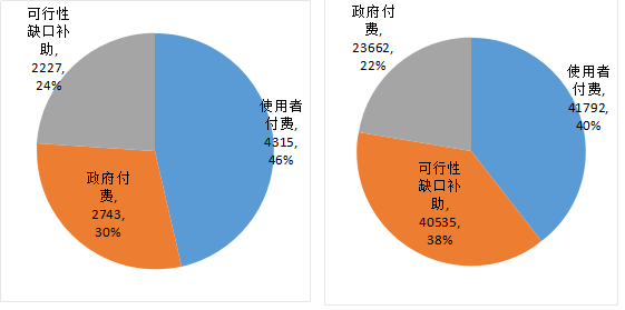 按照三种回报机制统计,使用者付费项目4,315个,投资额4.2万亿元,分别占入库项目总数和总投资额的46%和40%;政府付费项目2,743个,投资额2.4万亿元,分别占30%和22%;可行性缺口补助项目2,227个,投资额4万亿元,分别占24%和38%,如图2-5-1、图2-5-2。