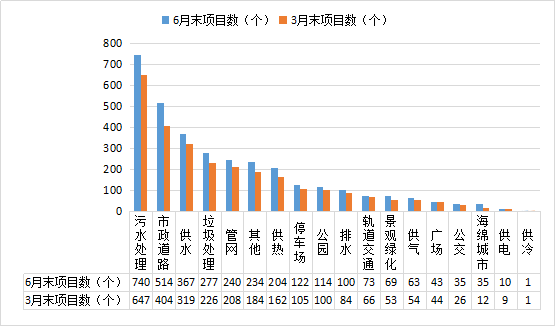 与3月末相比,新增项目537个,其中市政道路、污水处理、垃圾处理、其他、供水5个二级行业的新增项目较多,分别为110个、93个、51个、50个、48个,占新增项目的65.5%;新增投资额3,985亿元,其中其他、市政道路、管网、轨道交通、污水处理5个二级行业的投资额增长较大,分别增长839亿元、783亿元、652亿元、607亿元、281亿元,占新增投资额的79.4%,如图2-4-5、图2-4-6。
