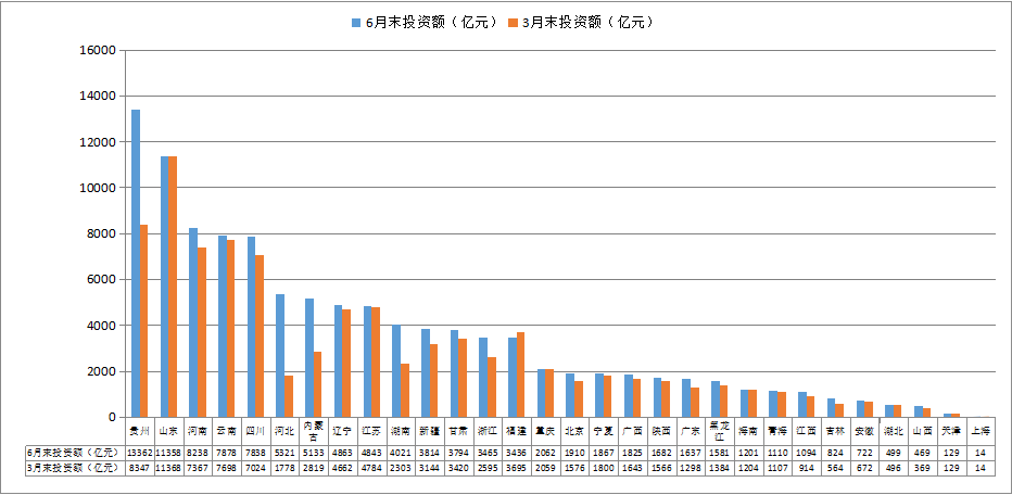 除山东因部分项目退库外,各地截至6月末的入库项目均比3月末多,内蒙古、河北、贵州和新疆新增项目数较多,分别为311个、237个、232个和231个,占全国新增项目数的64.6%。新增项目投资额较大的为贵州、河北、内蒙古、湖南、河南,新增投资额分别为5,015亿元、3,542亿元、2,313亿元、1,718亿元和871亿元。