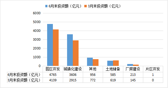 与3月相比,净新增项目77个,其中园区开发、城镇化建设、厂房建设、其他、片区开发分别新增42个、21个、12个、3个、1个;投资额净增加1,538亿元,如图2-4-9、2-4-10。