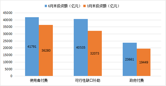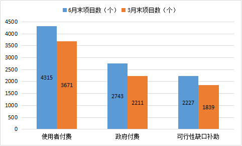 与3月末相比,使用者付费、政府付费和可行性缺口补助的新增项目分别为644个、532个、388个,新增投资额分别为5,512亿元、4,213亿元、8,462亿元。政府付费类和可行性缺口补助类项目数合计和投资额合计占比均比3月末提高1个百分点,如图2-5-3、图2-5-4。