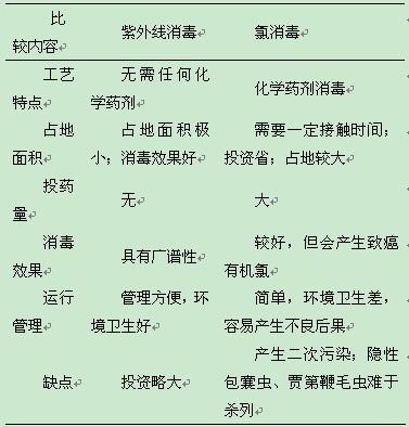 骤之一,具有非常重要的作用。在污水处理工程中得到广泛应用消毒方法主要有:液氯、二氧化氯消毒技术和紫外线消毒技术。紫外线消毒与氯消毒的比较如表1所