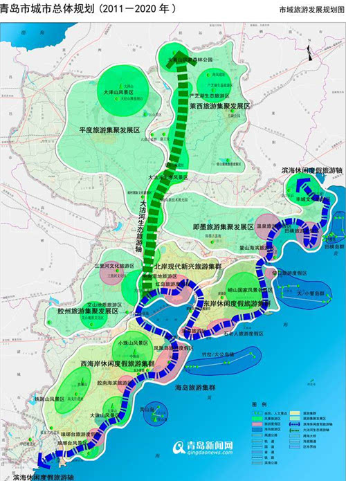 滨海蓝色经济发展带:在严格保护生态资源前提下,依托滨海大道、青连铁路等交通廊道,立足国内,面向东北亚,集中布局港口、滨海旅游、行政商务中心、蓝色硅谷等核心战略空间。