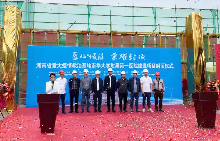 近日,湖南省重大疫情救治基地南华大学附属第一医院建设项目(EPC)封顶仪式在南华大学附属第一医院内施工现场举行,相关领导和员工代表共同出席封顶仪式。