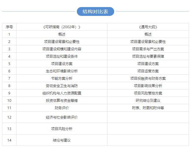两版的编写大纲从目标上来说基本是一致,主要体现为项目建设的必要性、项目方案的可行性和项目风险可控性。新版《通用大纲)在内容主要特点有两个方面: