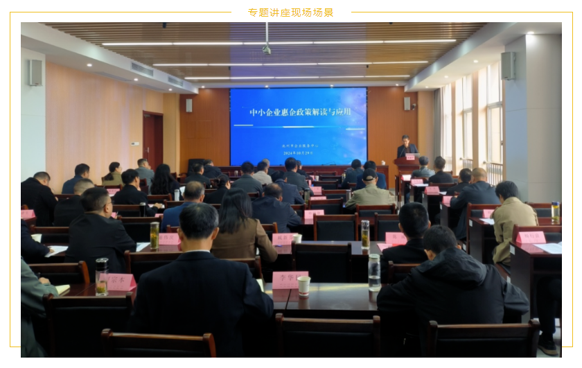市企业服务中心负责人胡建中担任主讲嘉宾。胡建中围绕“国家对中小企业的政策支持与方向”、“省、市、区当前主要政策”以及“企业如何更好地利用政策资源”等内容进行了深入浅出的讲解。本次参训的企业涵盖了制造业、农林业、住建、服务业、文化旅游业、交通运输业、采掘业等多个领域;胡建中有针对性地对适应这些企业的相关惠企政策进行了详细分析,并通过典型案例的剖析,使参会者对相关政策有了更直观的理解。