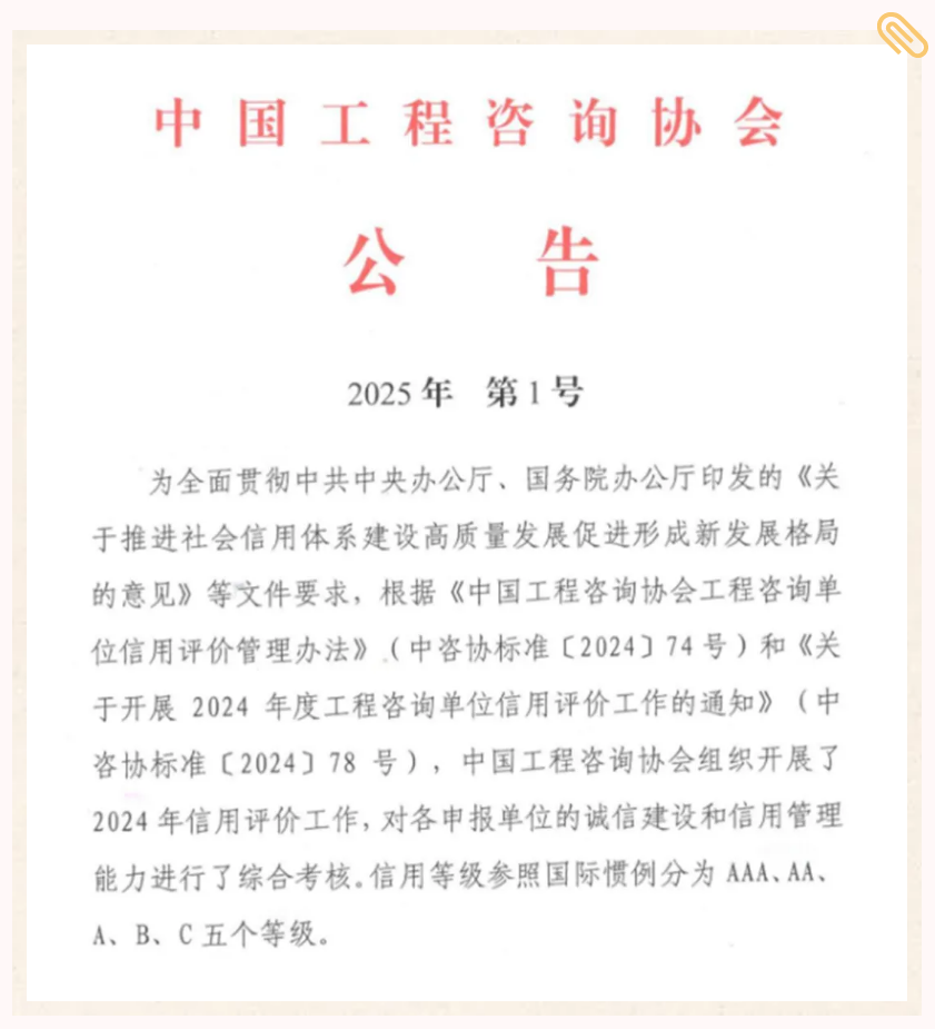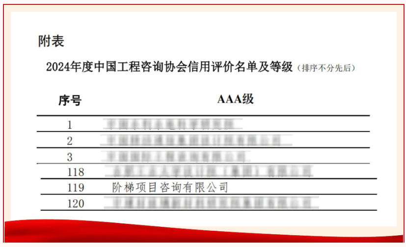 中国工程咨询协会1月10日发布的2025年第1号公告,公布了2024年度中国工程咨询协会信用评价名单及等级,阶梯咨询喜获工程咨询单位最高等级AAA级信用评价。