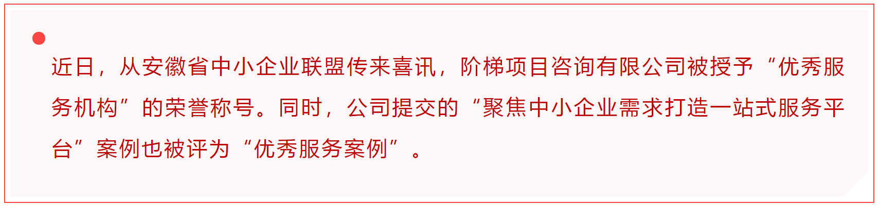 阶梯项目咨询有限公司是一家综合性咨询企业,自成立以来始终践行科学发展观,通过持续的技术创新,为客户提供卓越的技术方法和应用实践,致力于推动社会进步。2018年,公司承担了省“1+16+X”中小企业公共服务平台网络池州市级综合服务平台的建设任务,充分发挥信息、培训和技术等方面的优势,为中小企业提供了全方位的支持和服务。