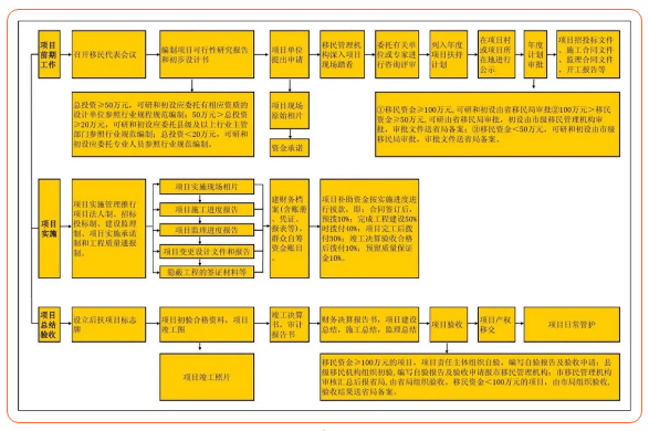 安徽省将项目实施细化为“谋划-审批-建设-验收”全链条管理。在项目谋划阶段,要求县级移民管理机构加强项目谋划和储备,督促指导乡镇政府及村民委员会,摸清水库移民占比高的村(组)、水库移民安置点底数和当地建设需求,召开村民会议或村民代表会议,宣传后扶政策,征求意见建议,谋划后扶项目。审批环节要求县级移民管理机构会同行业部门,督促指导项目业主单位按照国家有关规定履行项目选址、用地、环评和可研报告批复等前期工作手续。符合村庄建设项目施行简易审批相关要求的,尽量简化可研报告、用地、环评、乡村规划许可、施工许可等审批手续。可研报告可作为项目招标采购、建设实施和竣工验收的依据。