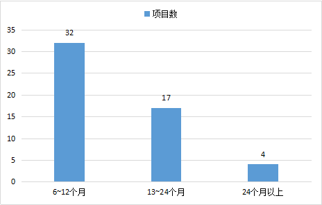 项目落地周期,指从项目发起到签署PPP项目合同实际花费的时间。目前,105个落地示范项目中,53个项目已录入落地周期信息,落地周期在6个月到43个月之间,平均13.5个月。具体情况详见图1-3。