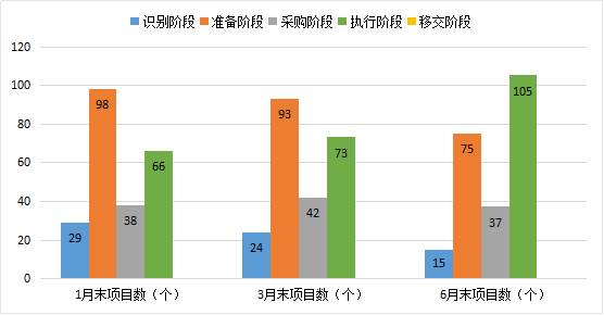 按落地率口径计算,1、3、6月末落地率分别为20%、21.7%、23.8%,呈现稳步提升特征。1、3、6月末准备、采购和执行阶段项目数如图2-2。