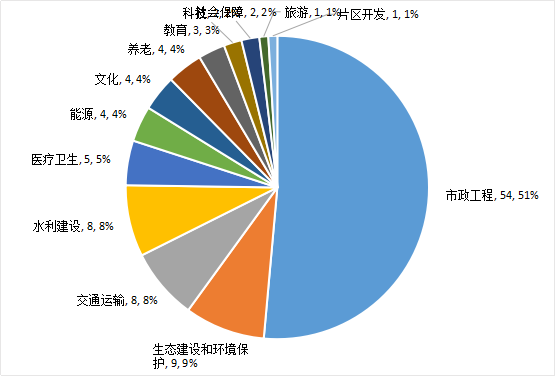 105个落地示范项目中,市政工程类项目54个,占51%;生态建设和环境保护9个,占9%;交通运输8个,占8%;水利建设8个,占8%;其他26个,占24%,详见图1-5-1。各行业示范项目总数与6月末落地数如图1-5-2。