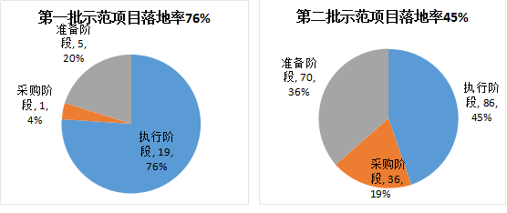 6月末,第一批示范项目中,执行阶段19个,落地率达76%,未落地项目以大型轨道交通项目为主,所需准备和采购时间相对较长;第二批示范项目中,执行阶段86个,落地率达45%,具体情况见图1-2-2。