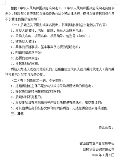 若供应商对上述结果有异议,可在成交期限届满之日起7个工作日内以书面形式在工作时间向阶梯项目咨询有限公司提出质疑,质疑材料递交地址:霍山县衡山镇中兴路19号(老教育局三楼),联系电话:(0564)5102895。若供应商对质疑处理意见有异议,可在规定时间内以书面形式向霍山县财政局政府采购办公室提出投诉。